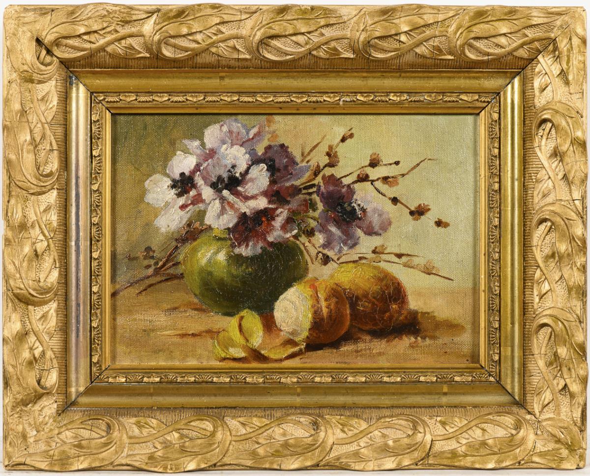 Impressionist painted flowers in green spherical vase and partly peeled lemons on the table. Little signs of age.