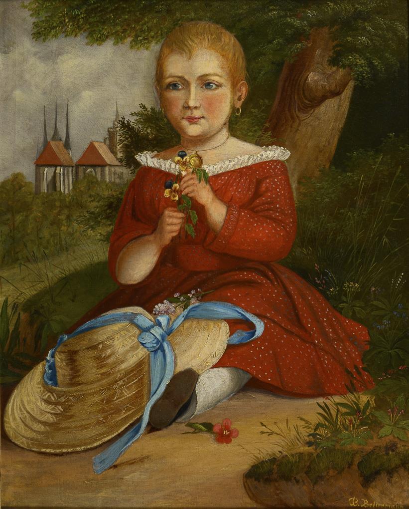 Portrait of a girl in a red dress playing with flowers under a tree, with the Cathedral and Severi Church in the background. Minimal signs of age.
