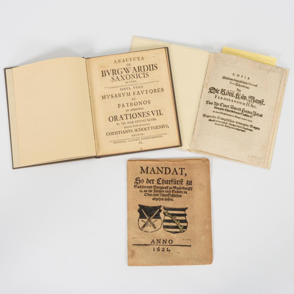 "Mandat, So der Churfürst zu Sachsen und Burggraf zu Magdeburg, an die Fürsten und Stände in Ober: und NiderSchlesien abgehen lassen." Anno 1621, 8 Seiten, ungebunden. / "Copia Dritten beweglichen Intercession-Schreibens, An Die Röm. Kay. Mayst. Ferdinand II. & c. von ... Herzog Johan Georgen, Churfürst zu Sachsen, de dato Dresden den 16. Martii Anno 1630. Wegen der Evangelischen betrangten Burgerschafft in der des D. ReichsStadt Augspurg in puncto Religionis, abgangen". 18 Seiten, jünger gebunden. / "Analecta de Burgwardiis Saxonicis altera, simul vero musarum Fautores ac patronos adaudiendas Orationes VII. (1748, 1750, 1747) Decenter invitat Christianus Schoettgenius, Rector, Dresdae, Literis Harpeterianis" und "Auspicia sanctissimi muneris ... M. Friderico Leberecht Kochio, Ecclesiae Torgaviensis Pastori Primario ... " (1801). 14, 12, 16, 15 Seiten zusammen im jüngeren Einband.