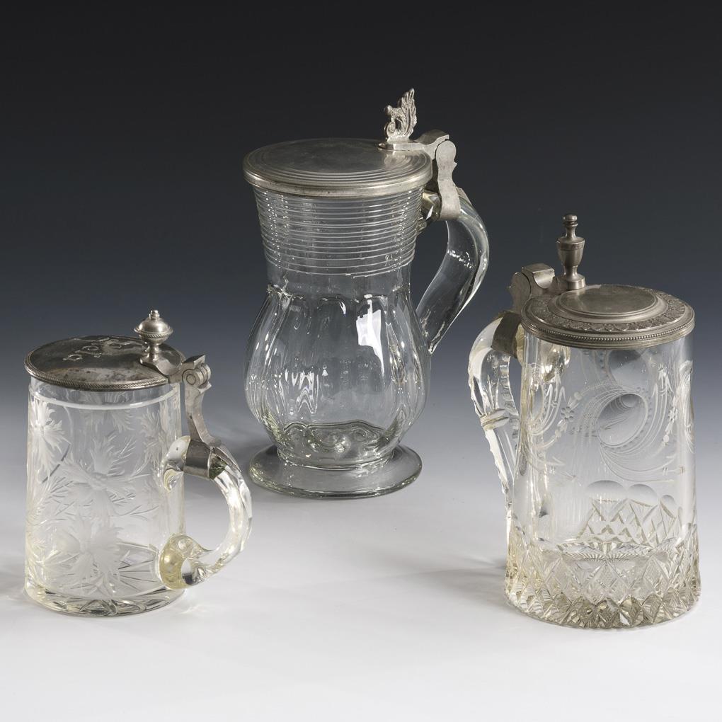 Colorless glass, pewter mounted hinged lid. H 14-20 cm.