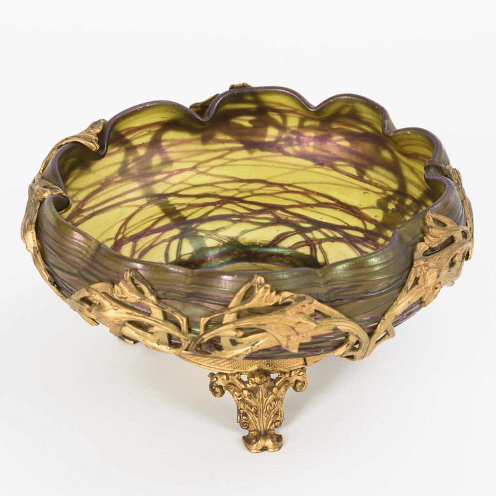 Flat bowl with tenfold pinched mouth rim. Set in a floral bronze mount with three feet.