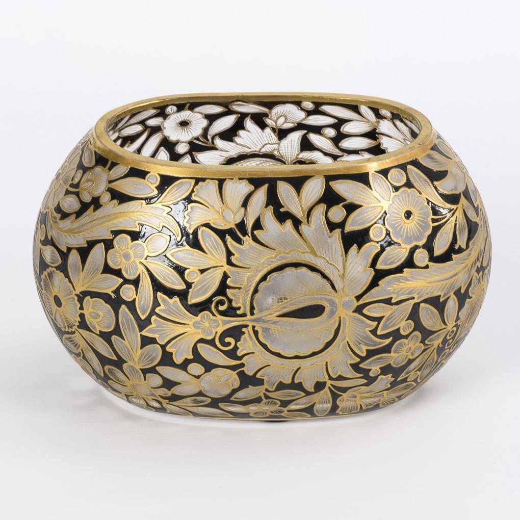Colorless glass, black lot painting, gold staffage. H 12,5 cm, L 21 cm.