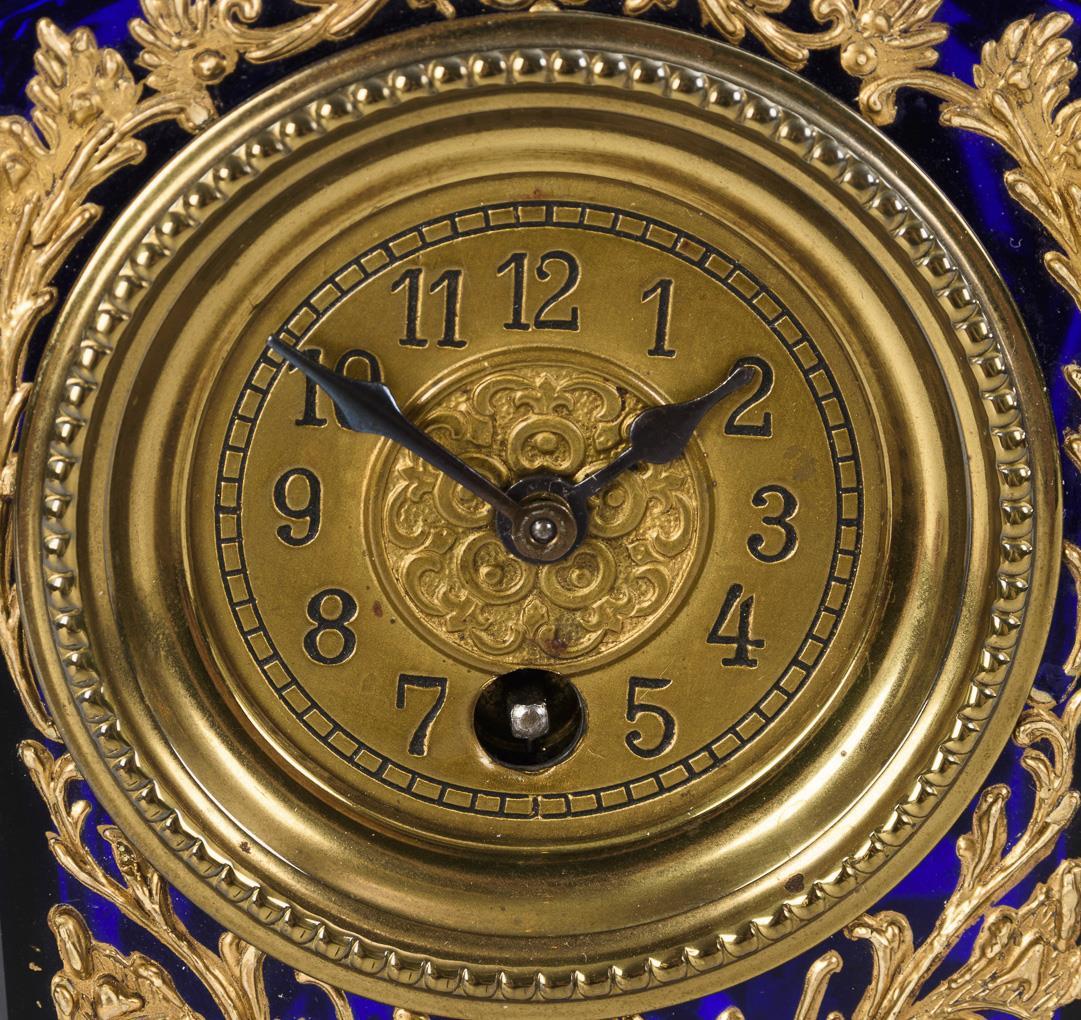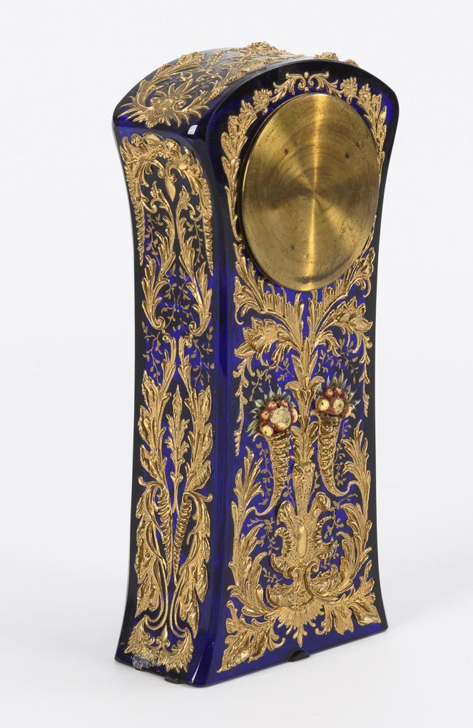 Desk clock with very elaborately decorated glass body.