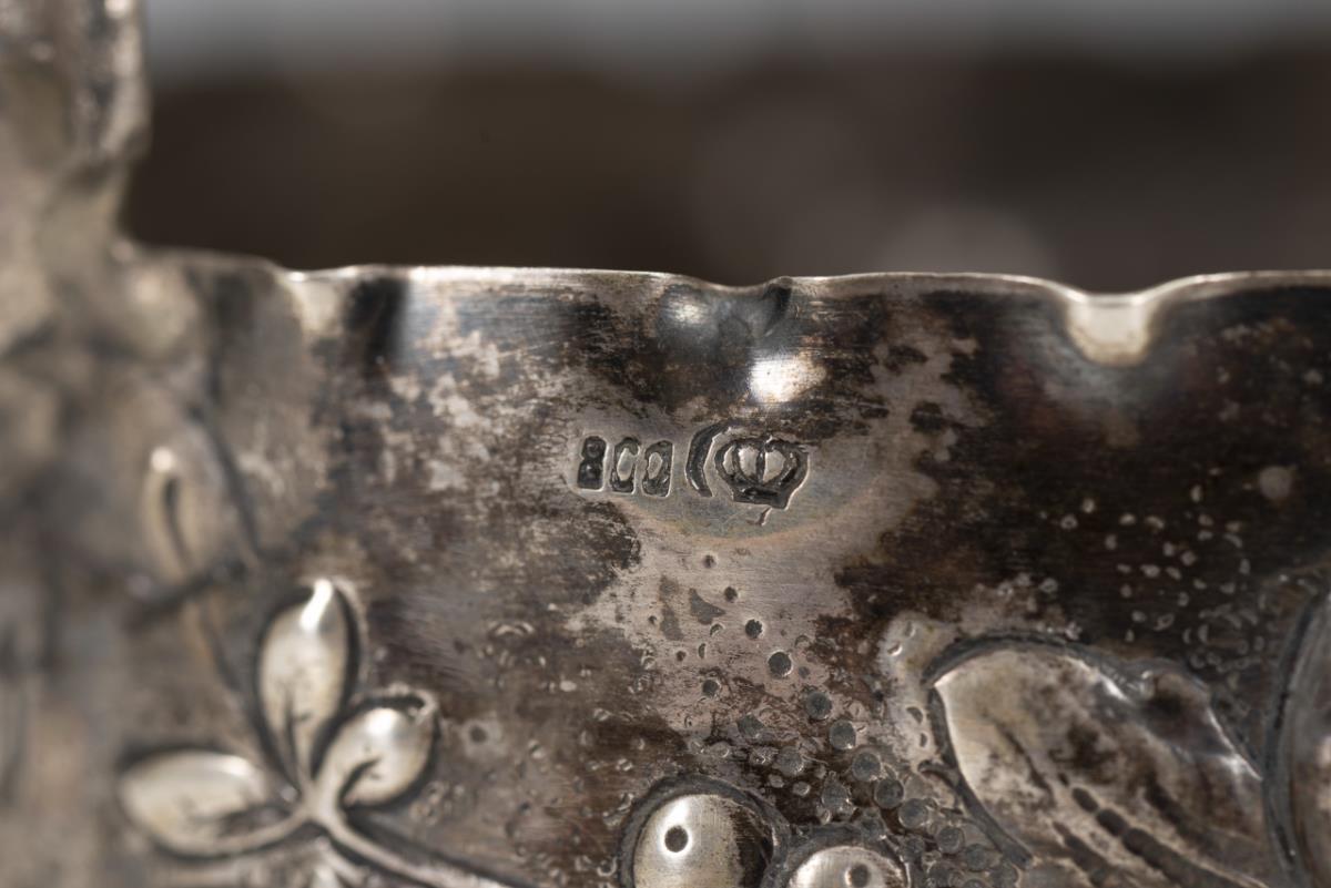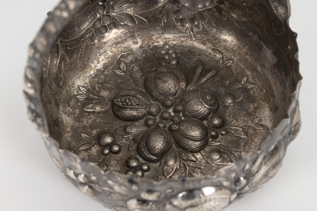 Silver handle bowl with fruit decoration.