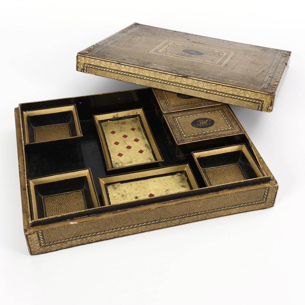 Flat square casket painted on all sides and on the fitting lid with filled mock cassettes and intertwined monogram (MJH?) in the cartouche. Inside 2 boxes and 5 bowls, partly with monogram and playing card motifs respectively. In need of restoration.