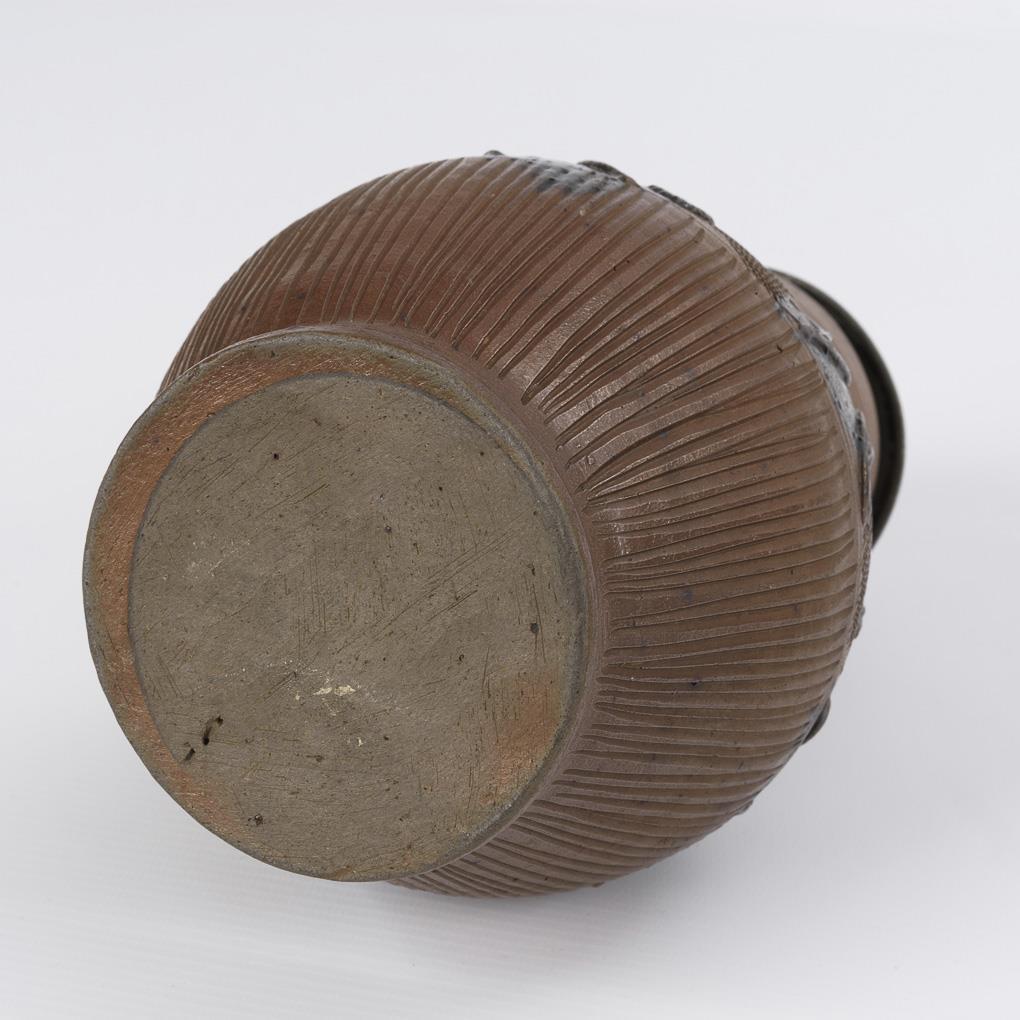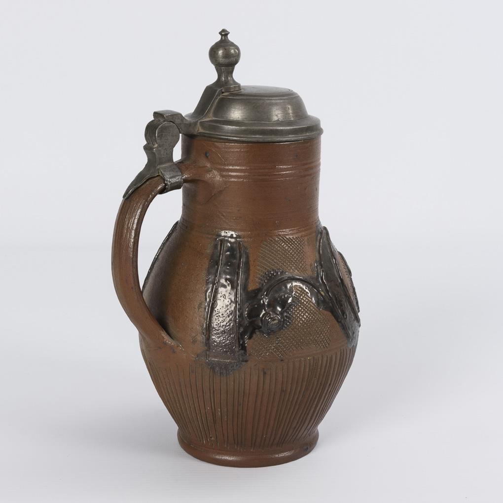 Brown salt-glazed stoneware jug with finely grooved cylindrical neck, bulged wall and ribbon handle. Vertical notch, criss-crossed fields and applied black engobed floral stems. Flat pewter lid with acorn pusher. Lid loosened, minimal rim bumping.