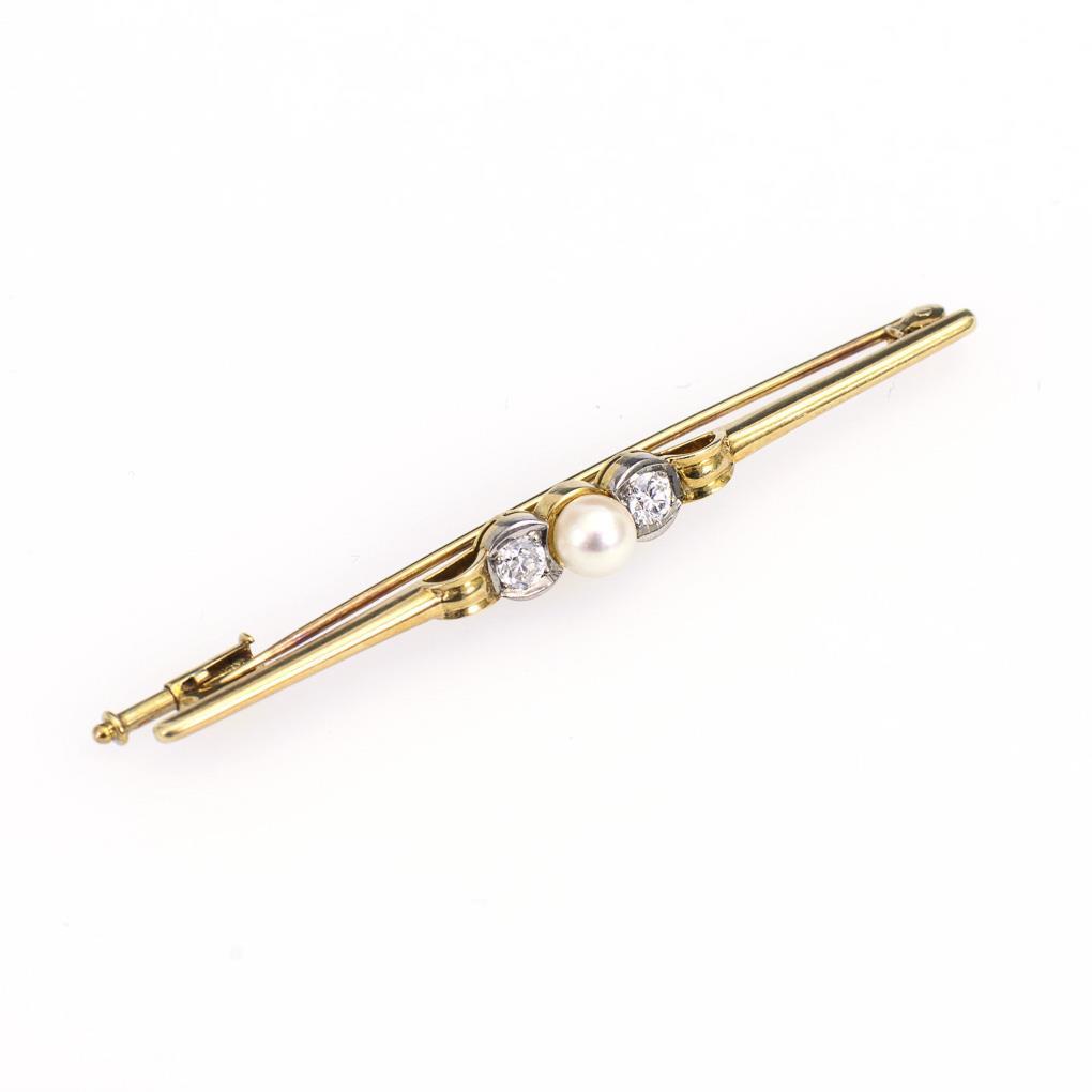 Cultured pearl and 2 diamonds between bar ornament. Sliding hook.