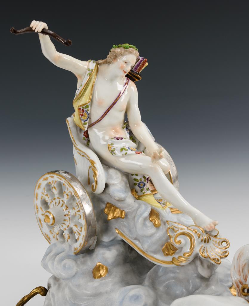 Nach einem Modell für die Porzellanmanufaktur Meissen, Entwurf von Johann Joachim Kaendler, 1773. Apoll auf einem von vier Pferden gezogenen, über Wolken fahrenden Triumphwagen, bronzemontierter Sockel. Beide Arme sowie Kopf des Apoll sowie 3 Pferdebeine restauriert.