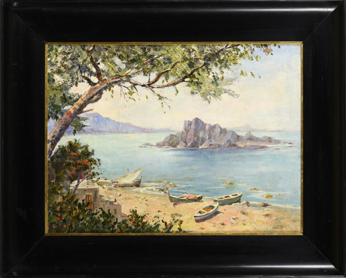 Boats on the beach in the sunshine with a view over the sea to the small rocky island. Minimal signs of age.