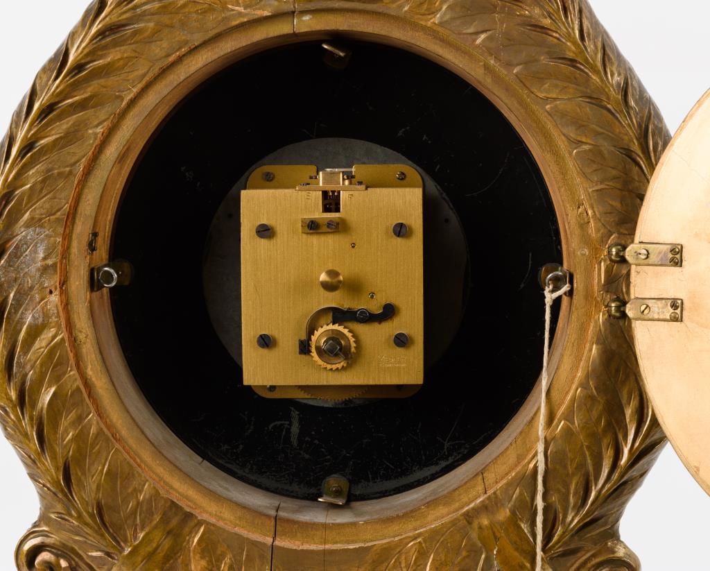 Holz, bronziert. Taillierter Korpus mit Muschelbekrönung und Lorbeerkranz, stiltypische Schnitz- und Reliefzier . Werk läuft.Holz mit Trockenrissen, Fassung teils berieben und gechippt, hintere Abdeckung schließt nicht.