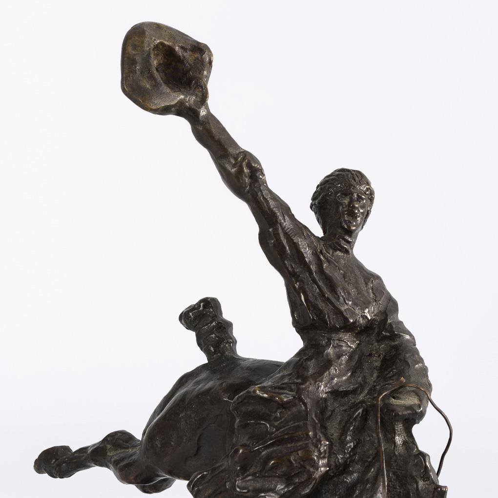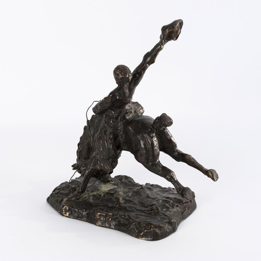 With the hat greeting rider on strongly bucking horse. Minimally rubbed, light verdigris.