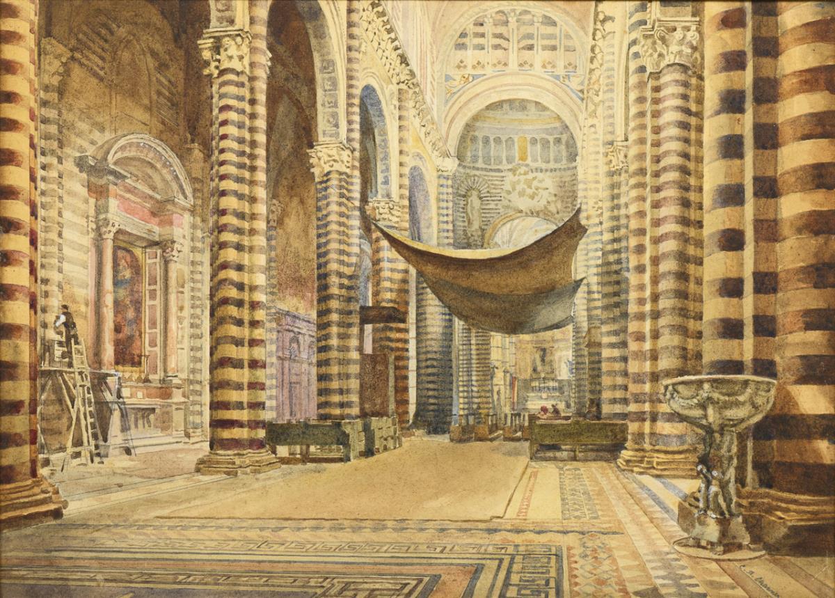 Magnificent church with restorer at work and spanned seats. Slightly browned.