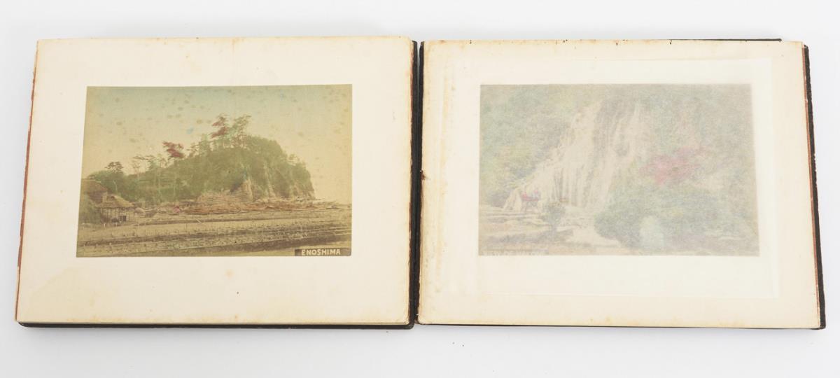 Views of Japanese cities and women doing everyday activities. Binding as lacquer work with pictorial motif, gilt edges. Signs of age, folding once torn.