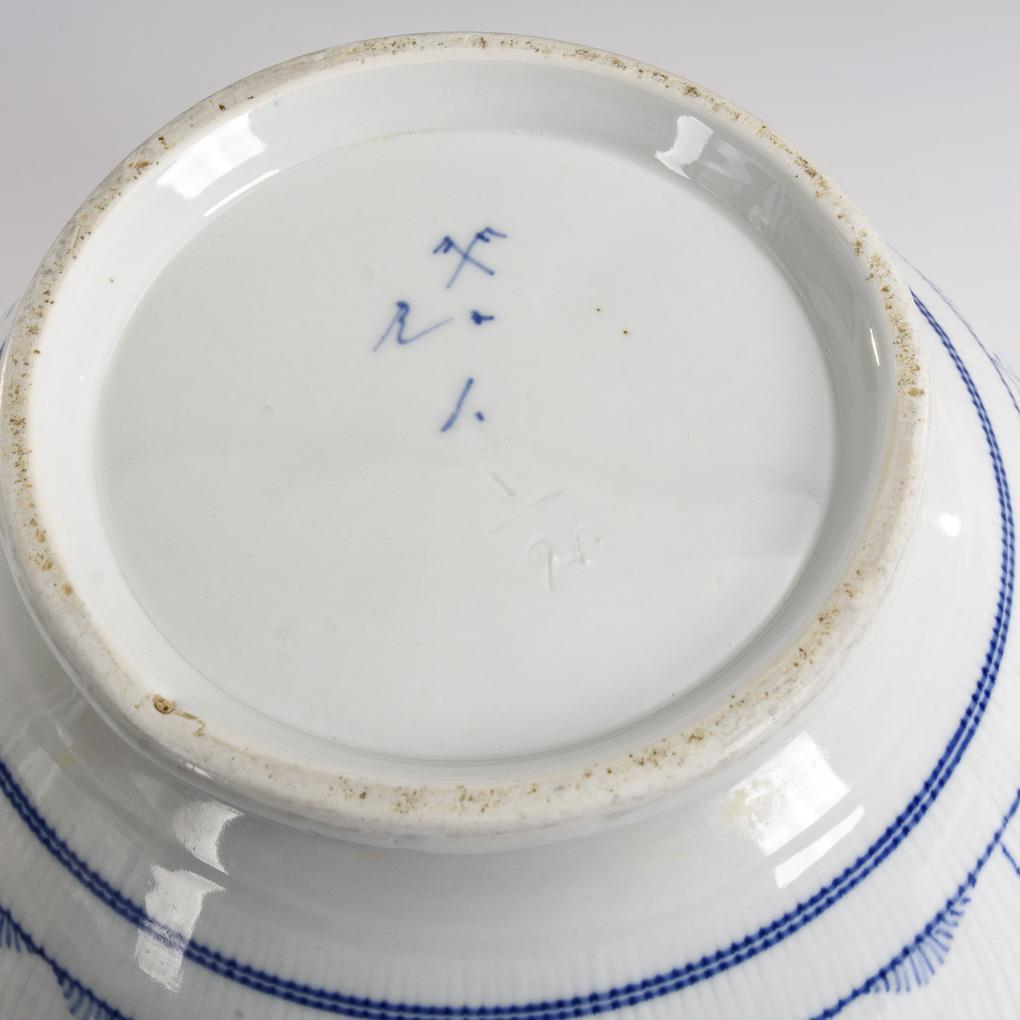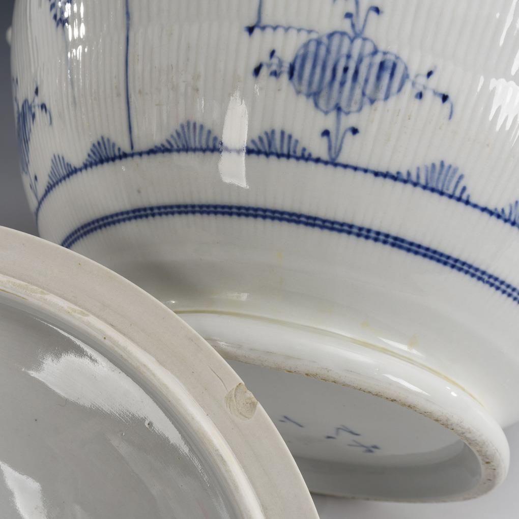 Bellied tureen with broken ribbed walls, two handles and knob lid with ladle recess. Bottom chip on lid rim, hairline crack in 1 handle.