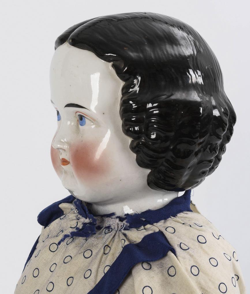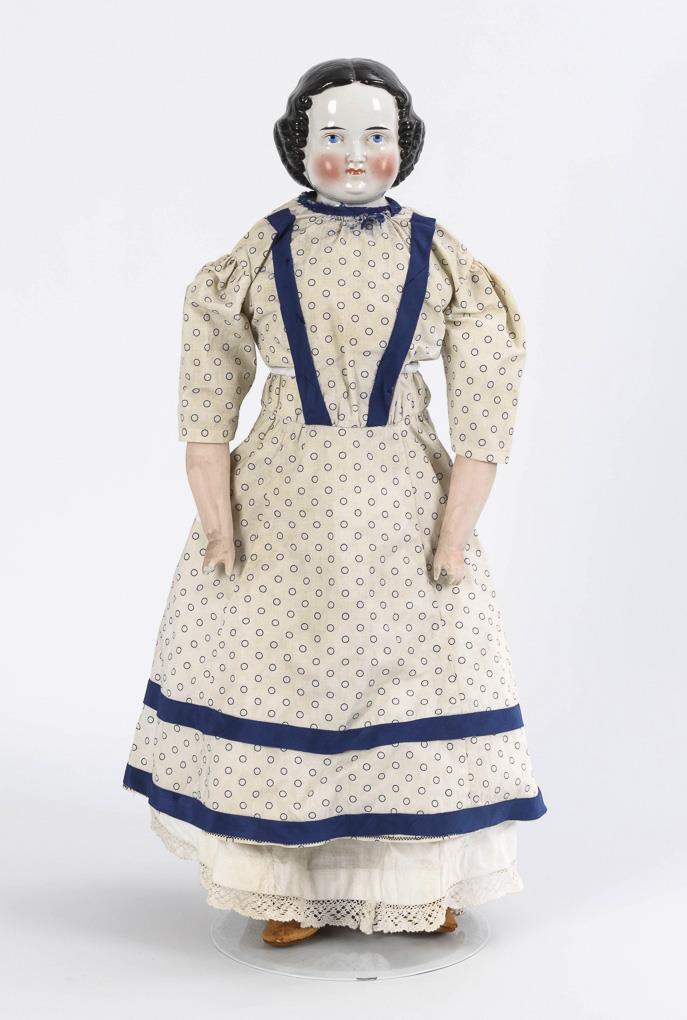Painted blue eyes, sculpted black hair. Fabric body with bisque forearms. Long white dress with blue trim. Several fingers bumped.
