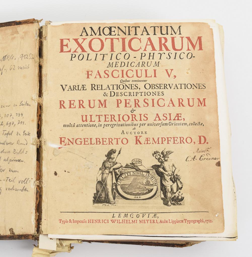 Kaempfer: 1651 Lemgo - 1716 Lieme, German physician and explorer. In the course of an exploratory voyage (1683 to 1693) that took him via Russia and Persia to India, Java, Siam and finally Japan, he gathered a great deal of knowledge about the geography, nature, society, religion, politics, administration, and the sciences and arts of the regions he traveled. His writings are considered important contributions to the early modern exploration of the countries of Asia. At the same time, they shaped the European image of Japan in the 18th century and served as a reference work for many explorers until the early 19th century.