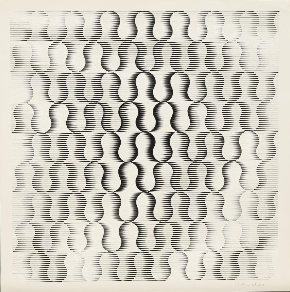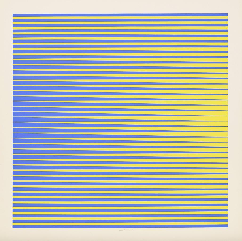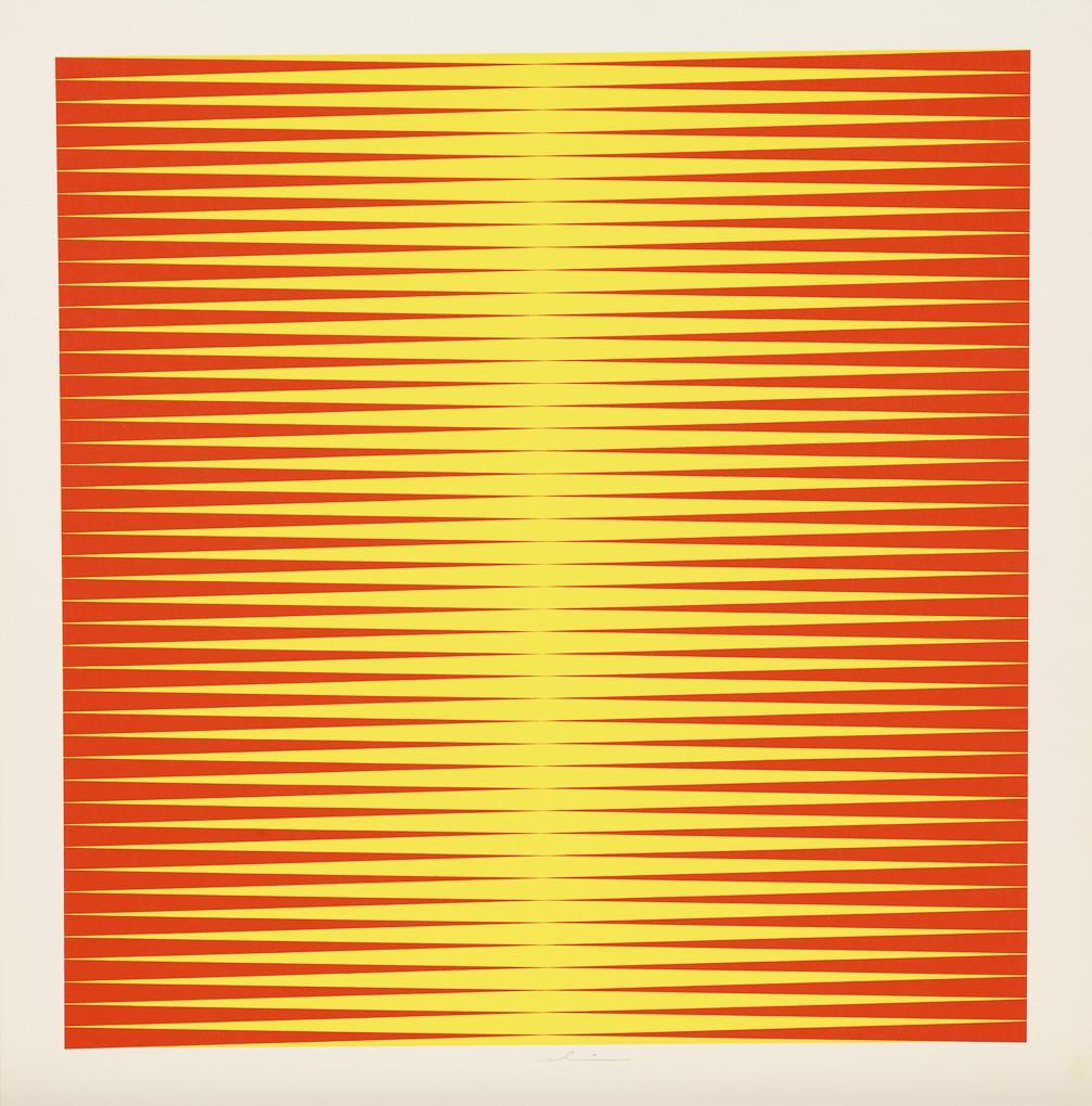 2 Op-Art works Getulio Alviani: yellow-blue-striped, sheet: 49.5 x 50 cm | yellow-red-striped, sheet: 51 x 50 cm | 1 Op-Art work H. Andree ?, sheet: 59.5 x 59.5 cm, upper margin creased.