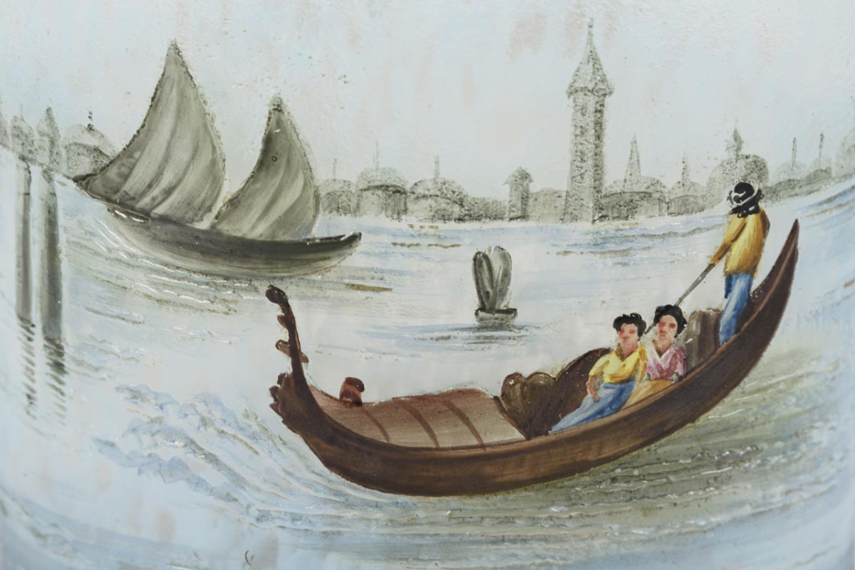 Plated cylindrical vase with sloping wavy rim. With the etched and colored painted depiction of waves and a gondola and the veduta of Venice in the background.