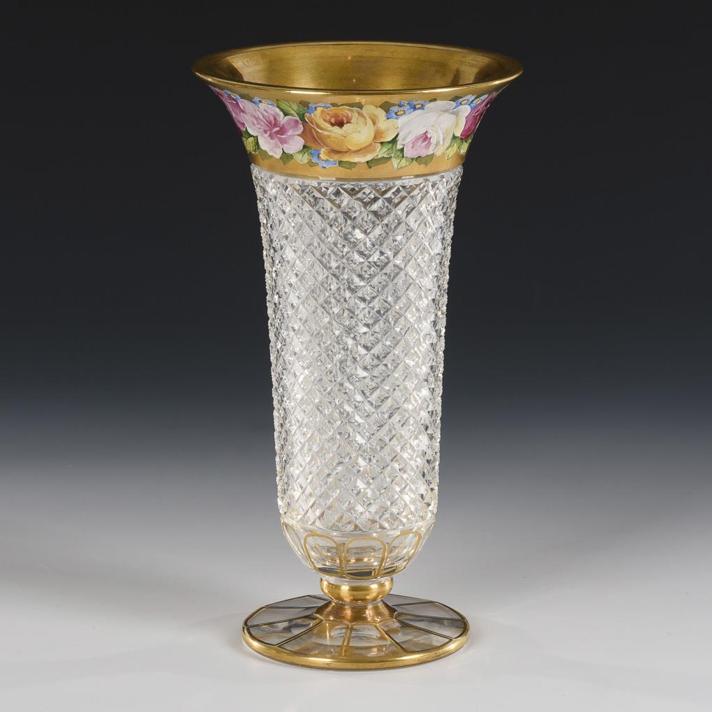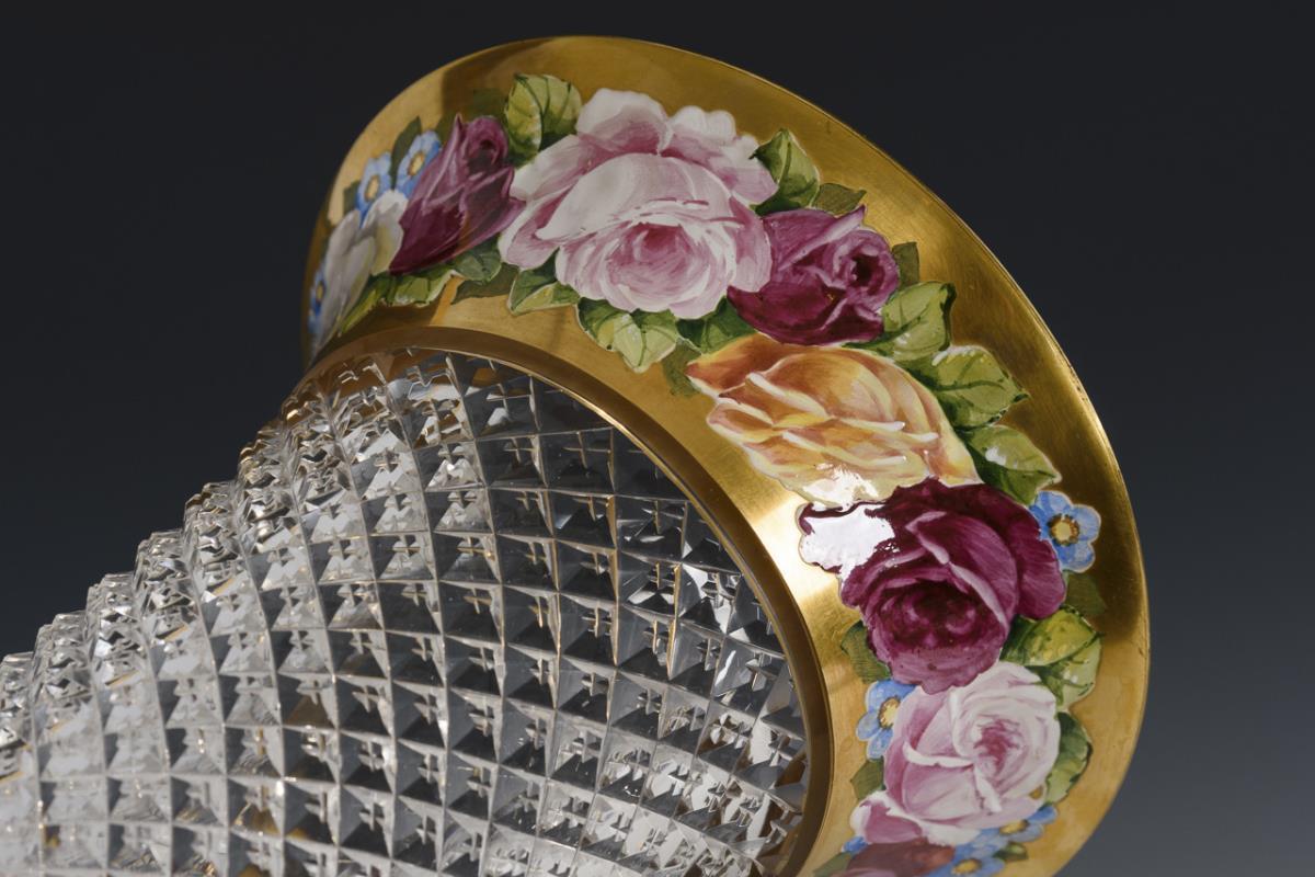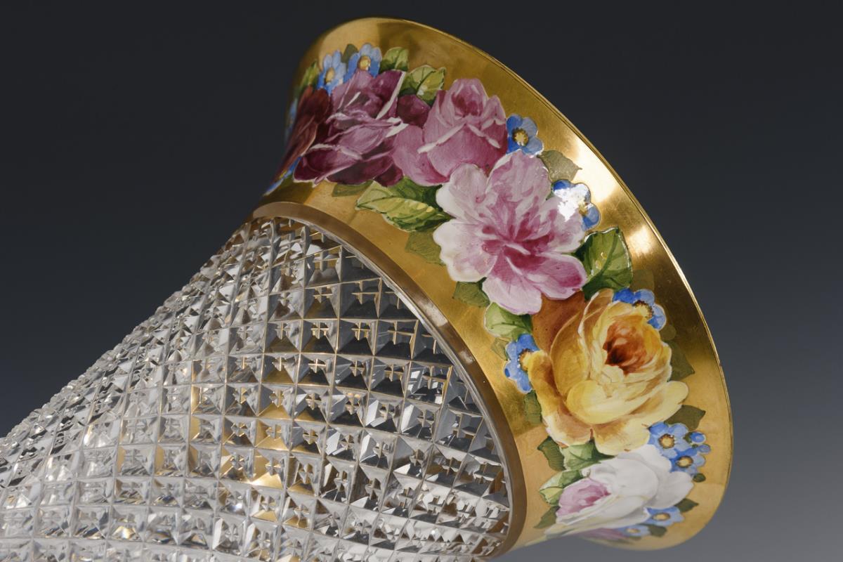 Colorless glass, polychrome enamel painting, gold staffage; dislocated demolition. H 24 cm.