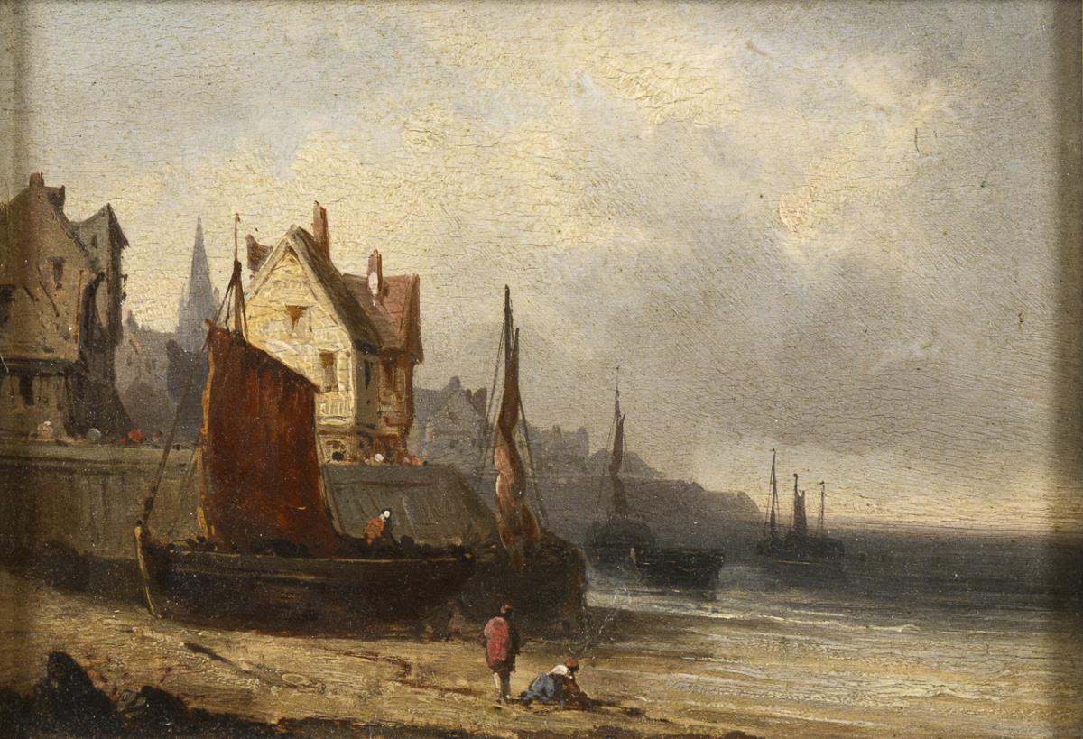 Boats and staffage figures on the shore with views along the houses on the sea. Somewhat soiled, 1x minor retouching on the edge.