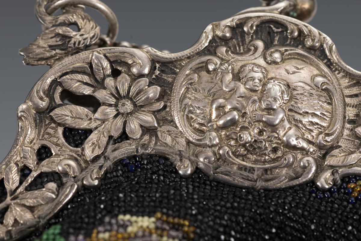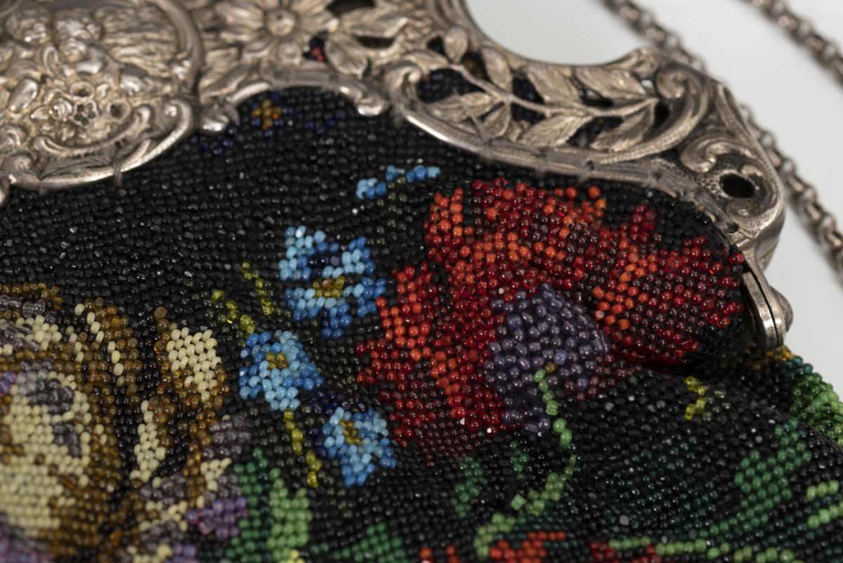 Black-ground, fully embroidered beaded bag. Reliefed and floral openwork bail, on pea chain handle. Small repair at bottom.
