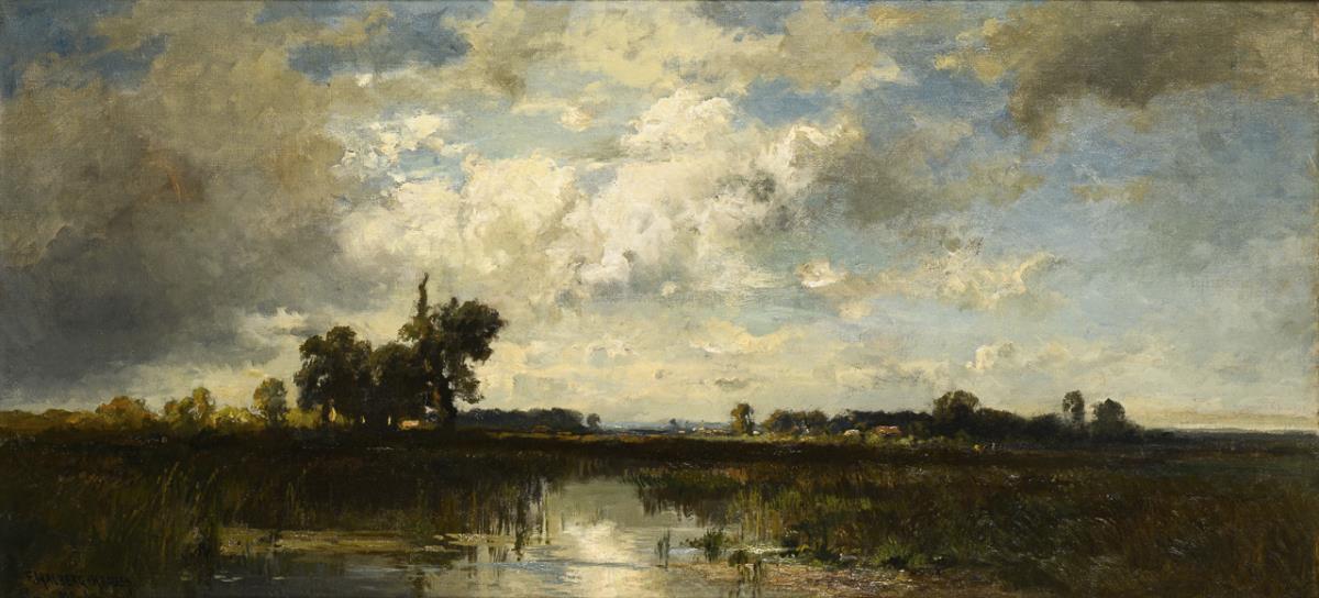 Wide landscape panorama with lake and village at a grove under cloudy sky under cloudy sky. Light traces of age.