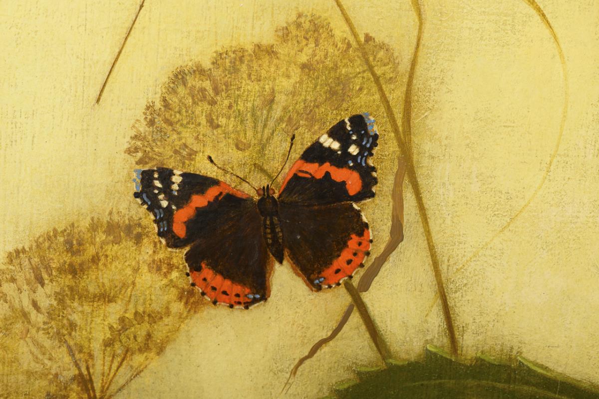 The sunflowers with admiral and bird house in the sunshine. Traces of age.