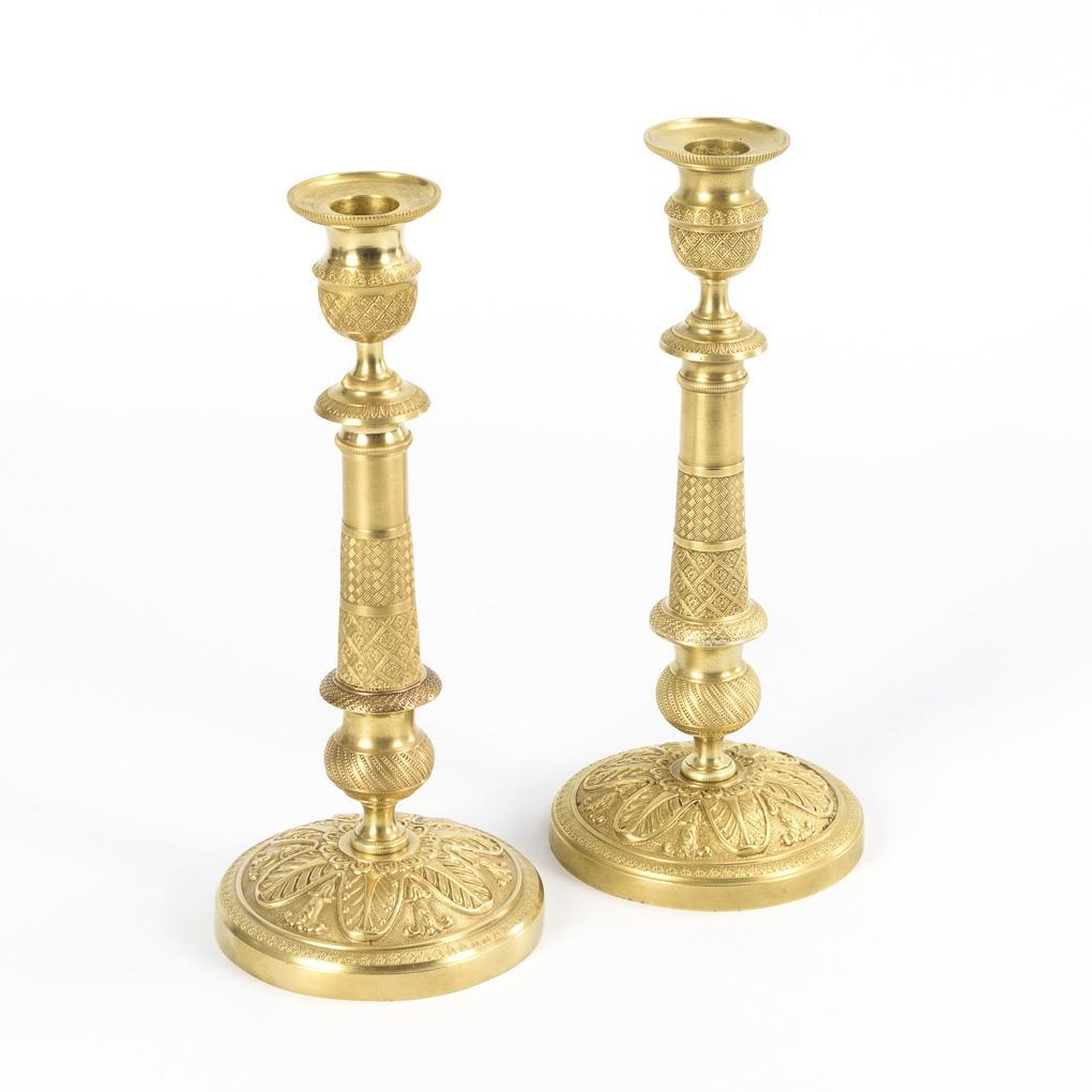 Bronze chandelier in column form decorated with fine relief ornament and leaf rosette.