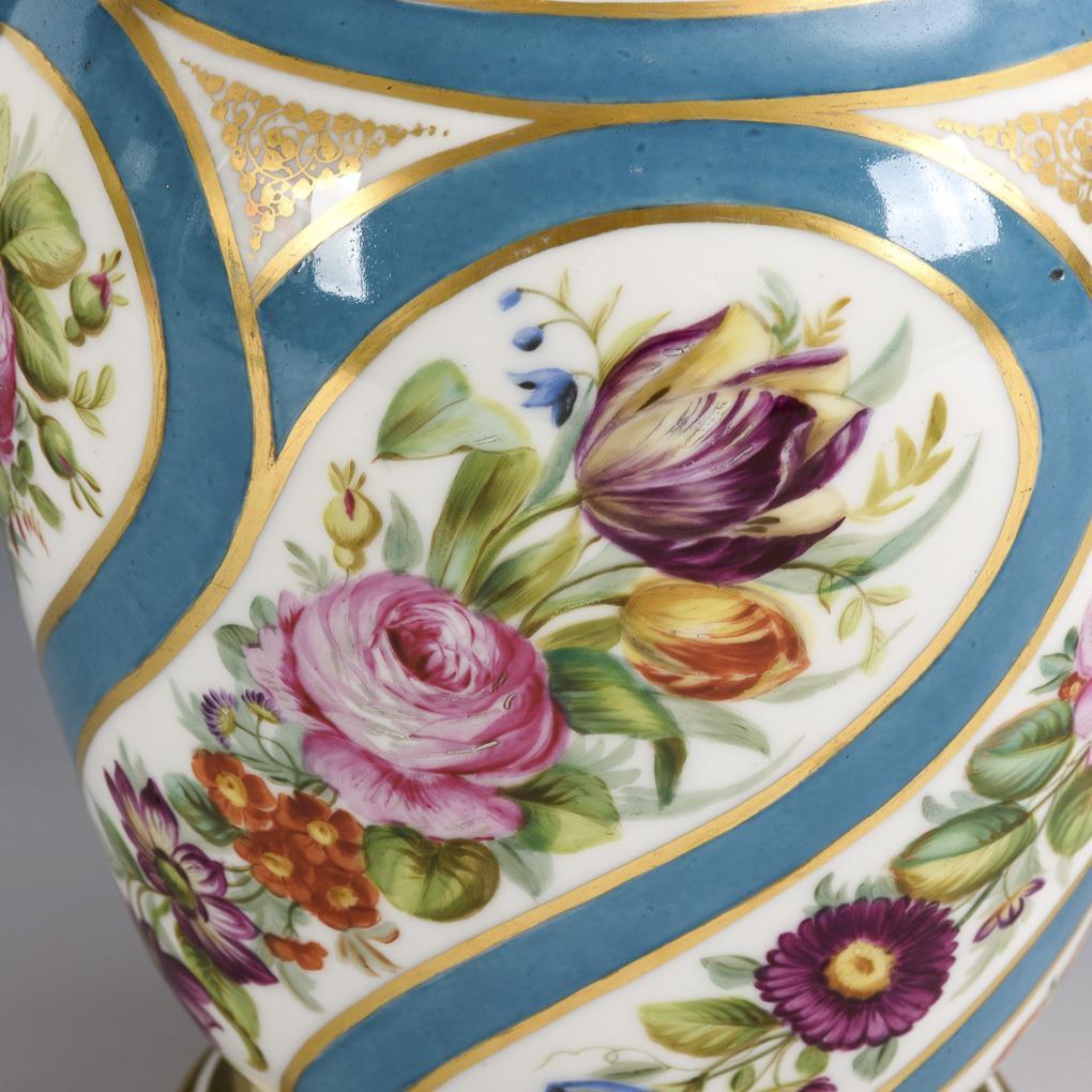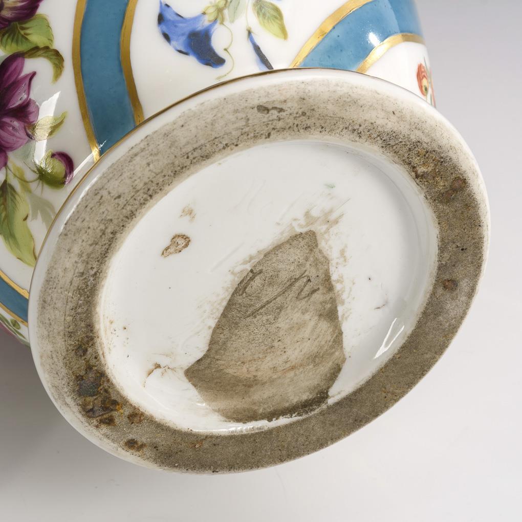 Baluster vase with crater neck. Between blue straight and diagonal fond strips floral bands and bouquets. Minimal gold abrasion.