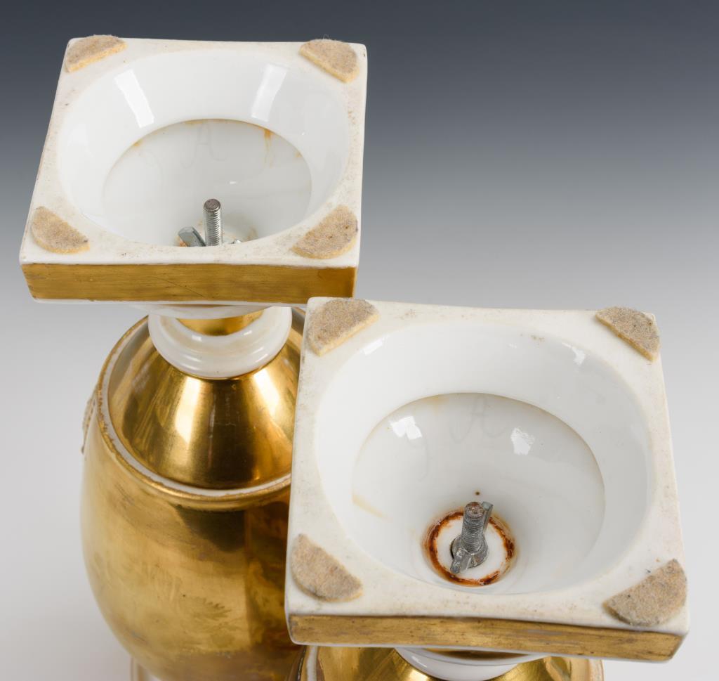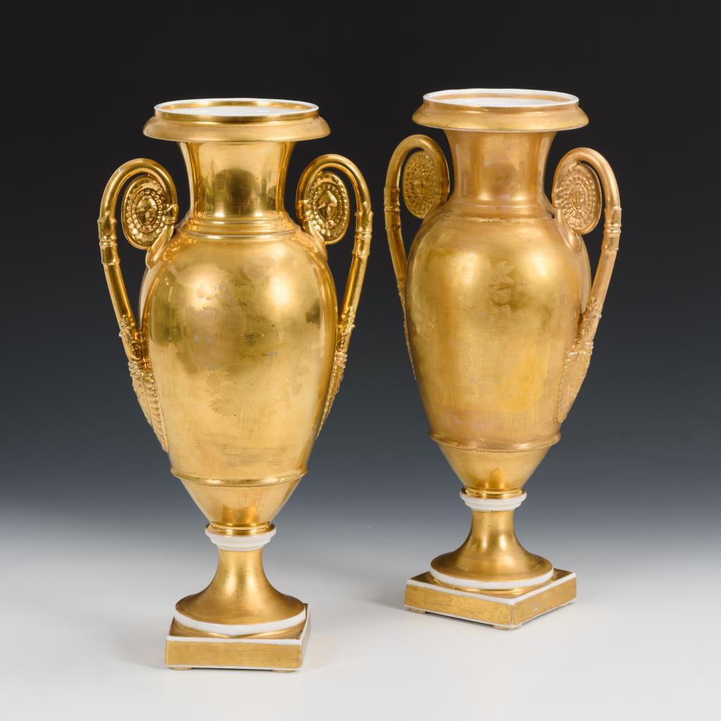 Ovoider Korpus mit zwei Maskaronhenkeln, Kraterhals, Rundfuß, auf Quadratplinthe. Goldfond, schauseitig ein Ovalmedaillon mit Jahreszeitendarstellungen (Frühling und Sommer). Gold etwas berieben und teilweise retuschiert, 1 Henkel restauriert.