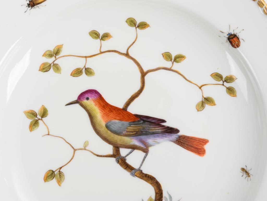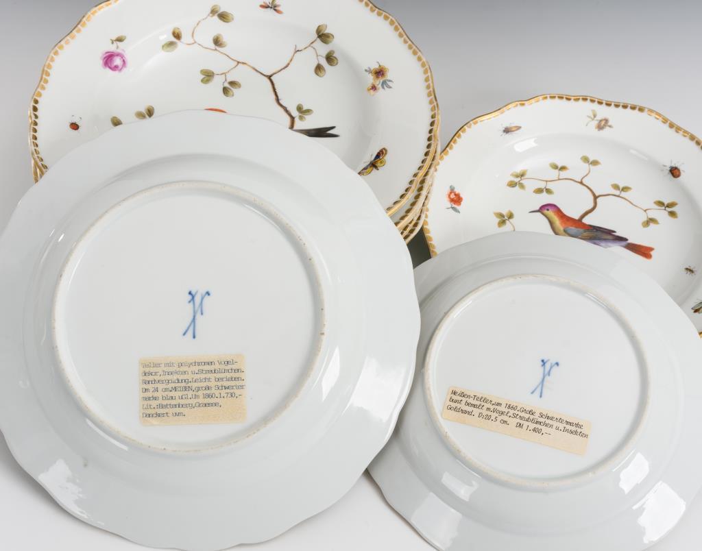 6 Speiseteller und 2 Salatteller mit gewelltem Rand. Im Spiegel ein im Baum sitzender Vogel, auf der Fahne Streublümchen und Insekten . Partieller Goldabrieb.