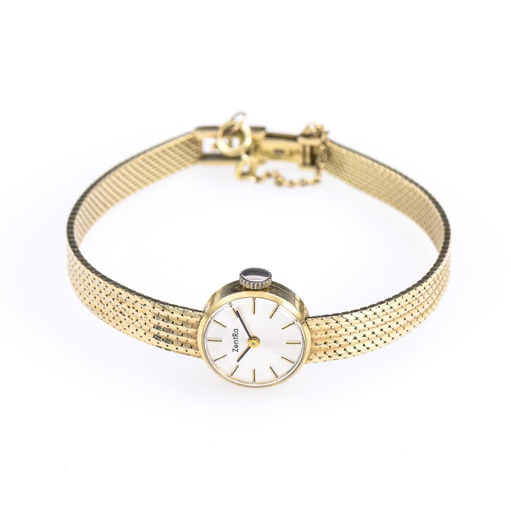 Case with spring crown, dial with dash numbers between milanese strap with clip closure and safety chain. Movement runs. Watch crystal with small crack on the side.