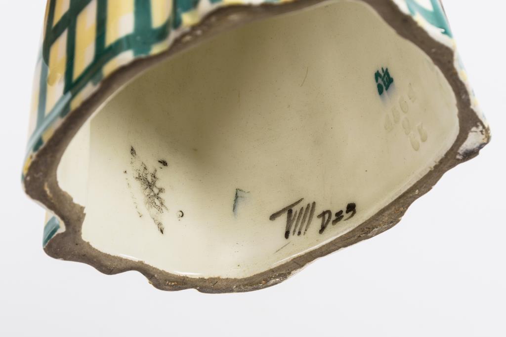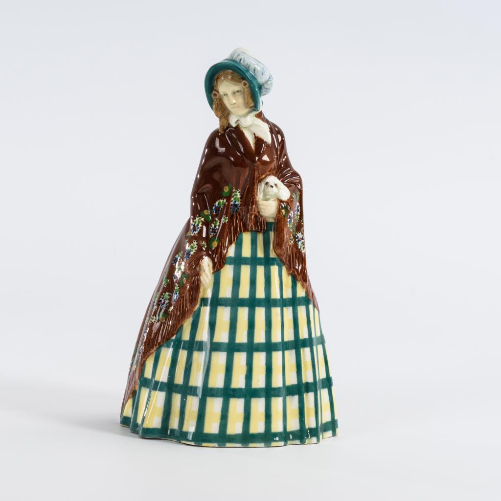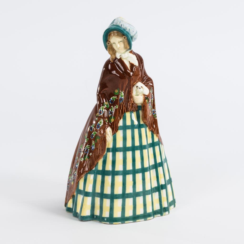 Mädchen in grün-gelb karierter Krinoline mit braunem Umhang und grünem Federhut, einen weißen Hund in der linken Hand haltend. Hut restauriert, verso kleiner Randchip.