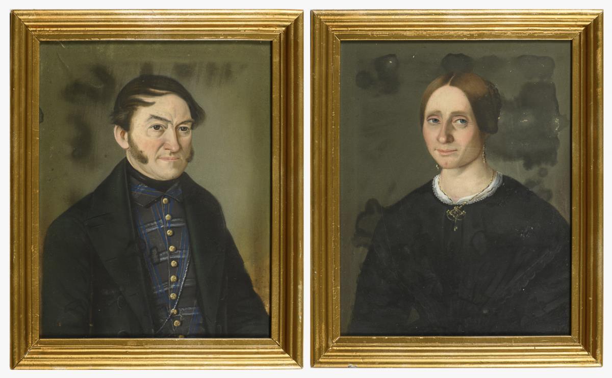 Fine painted hip portraits of the couple: Johann Wilhelm Sauer, Schwarzbüttnermeister (1799-1853) and Johanna Sauer, née Hiob (*1811 in Heinrichs). Probably moisture damage.