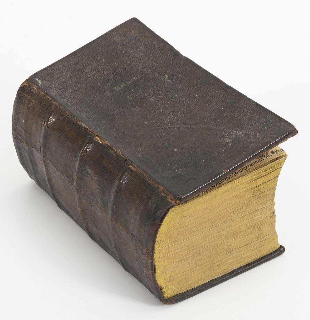 Also intended as a travel bible. Two colored views of Esslingen and Rolandseck pasted in the endpapers. Leather binding with yellow edges. Block original closely trimmed. Traces of use.