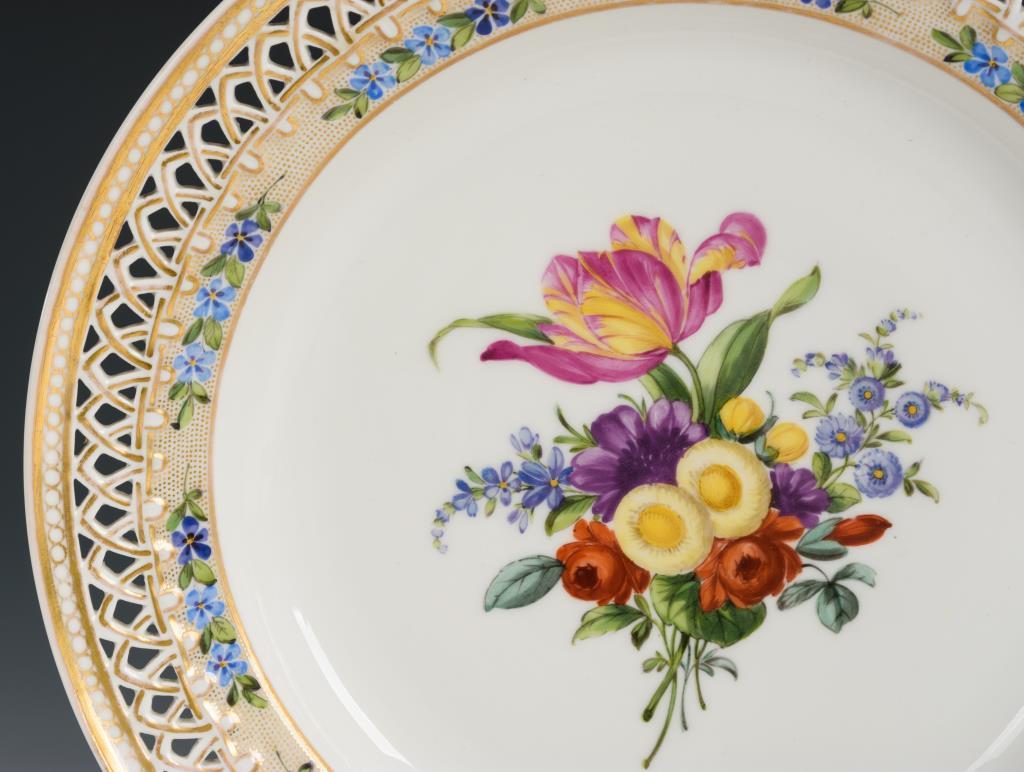Form "Englischglatt" mit halbdurchbrochener Fahne. Im Spiegel ein Blumenbukett.