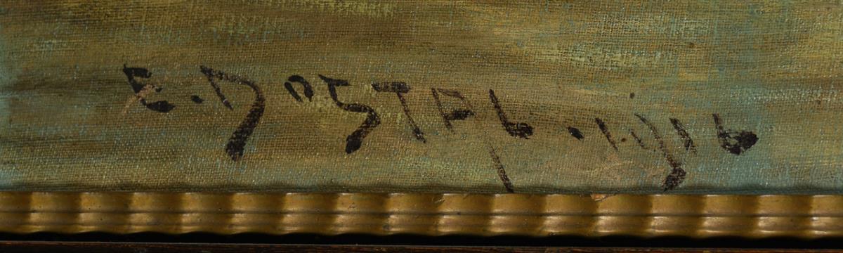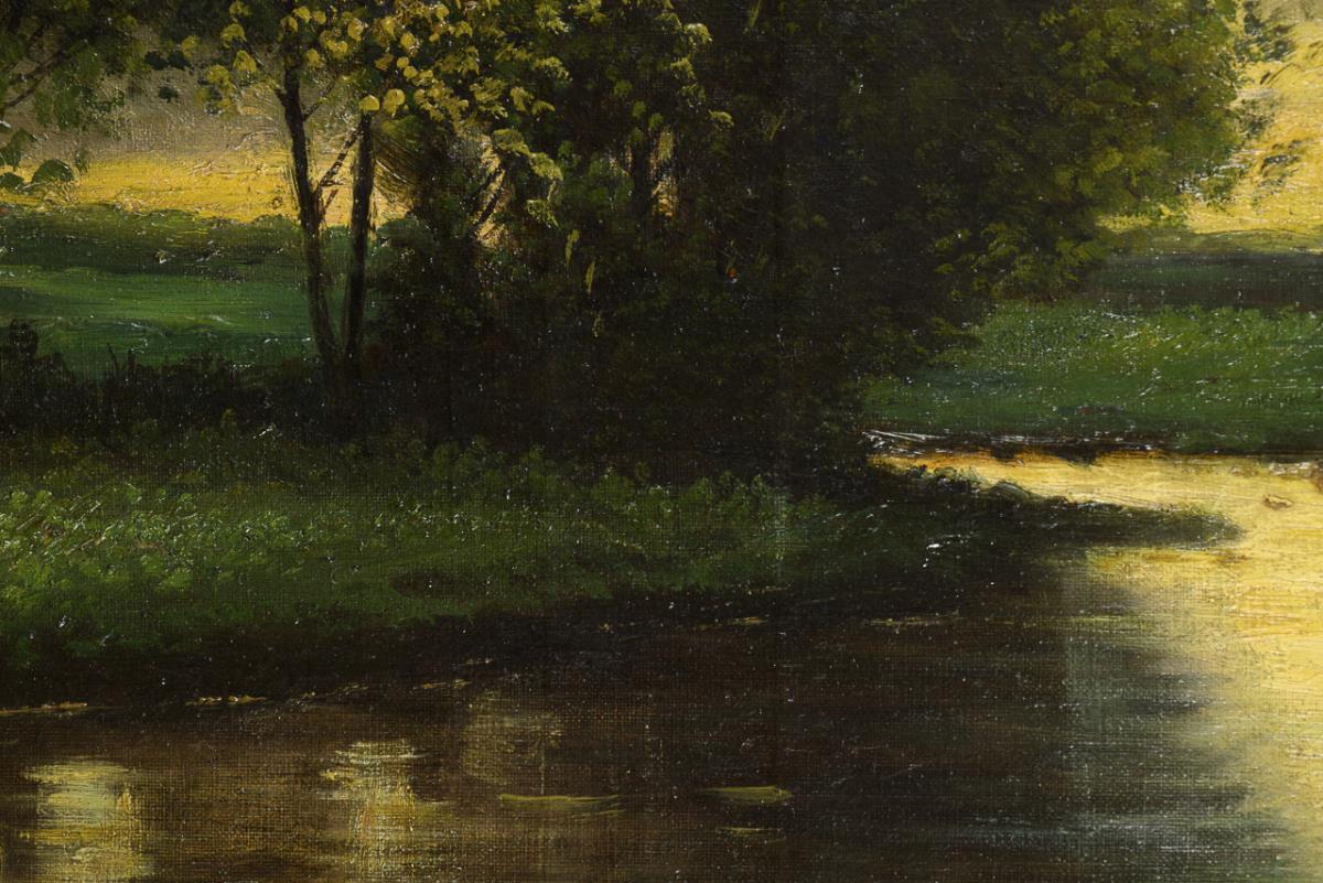 Leisurely flowing water between lush green meadows under cloudy sky. Light traces of age.