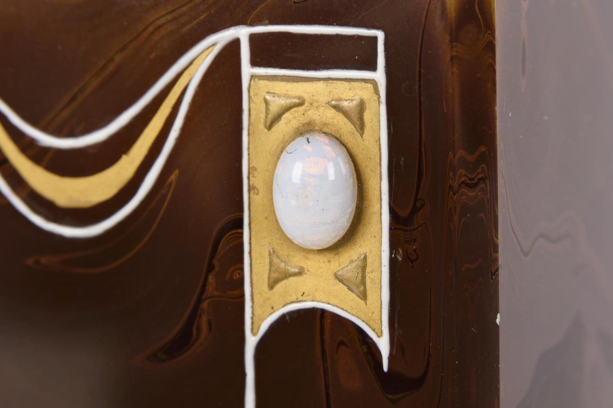 In brown tones stone glass marbled opal glass, gold staffage, enamel painting. H 15 cm.