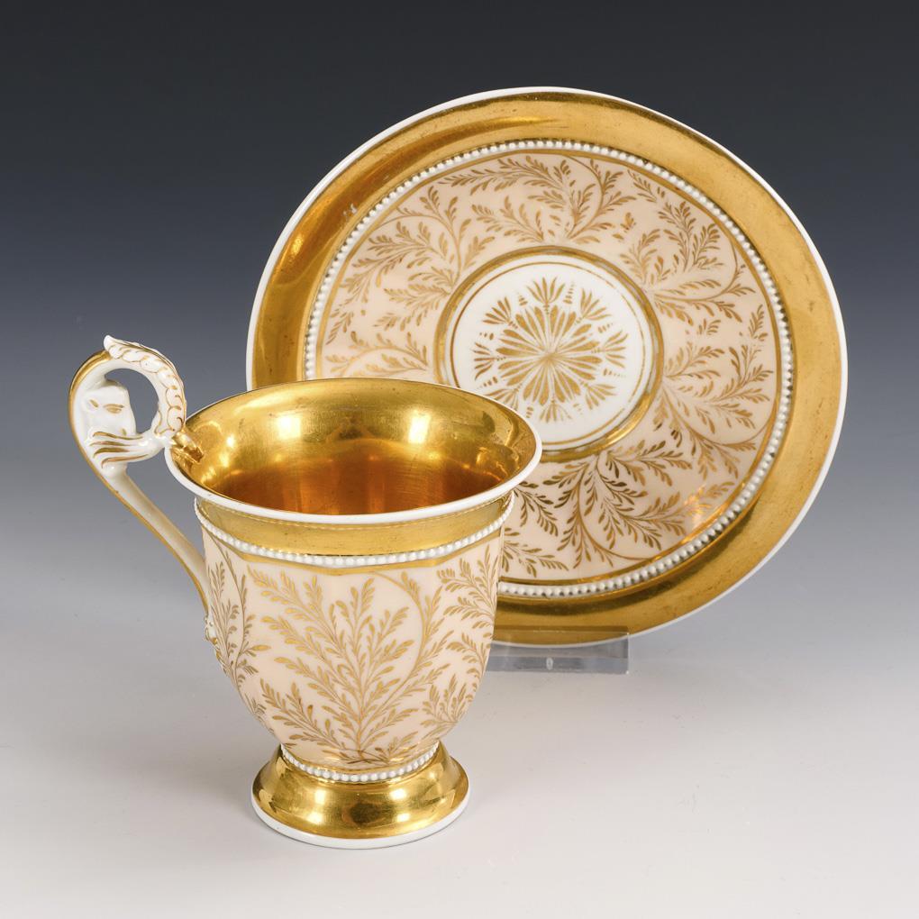 Polygonal footed bell cup with ram's head handle and pearl band. Circumferential vegetal gold painting on salmon background, gold fond. Bottom rim bowing on the saucer.