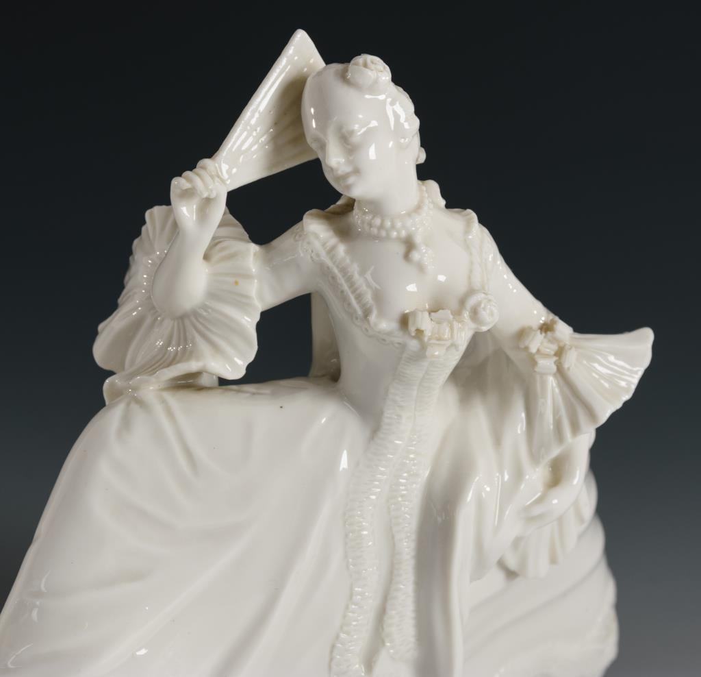 Einen Fächer in ihrer rechten Hand erhebende, stehende Dame im weiten Reifrock. Bestoßungen an den Schleifen.