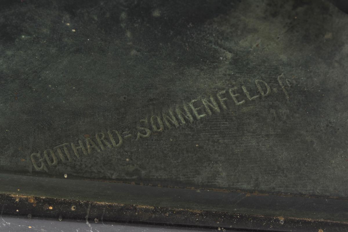 Bronze black patinated with partly greenish shimmer, black marble plinth. Inscribed. H 36 cm, total 40 x 27 x 13 cm.