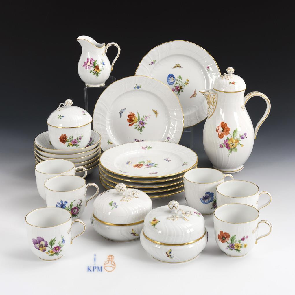 24 parts. Model "Neuozier". Coffee pot, creamer, sugar bowl, 6 cups, 6 saucers, 7 breakfast plates and 2 bonbonnières (Ø 11,5 cm).