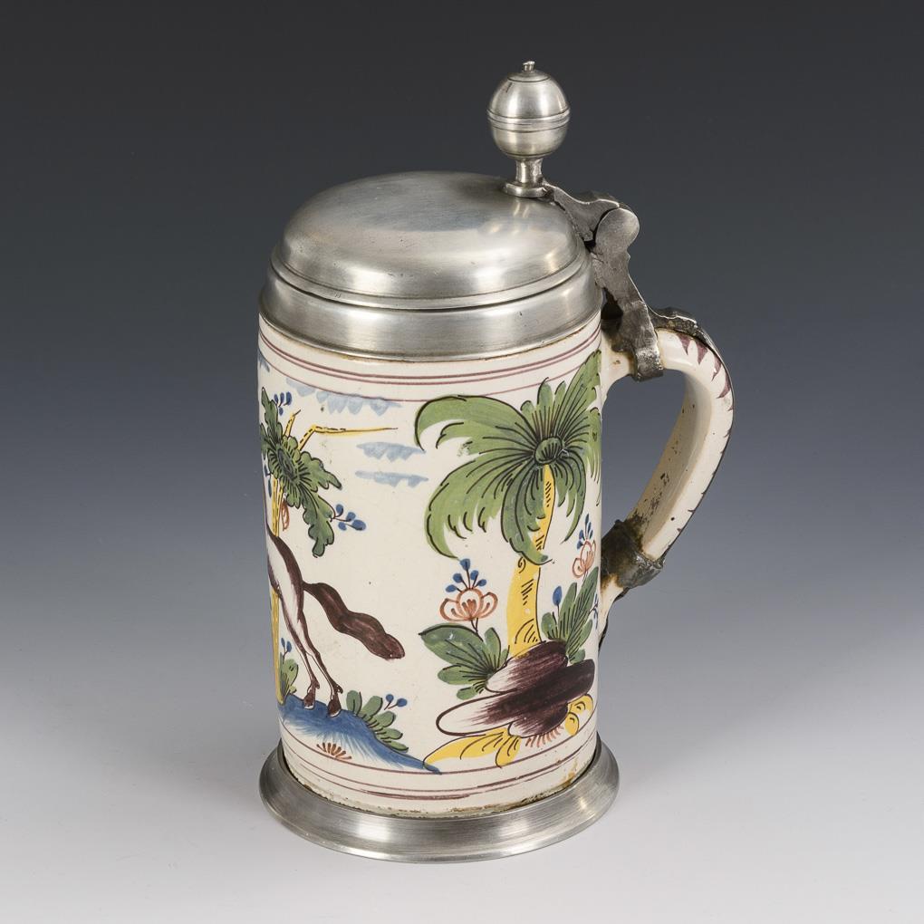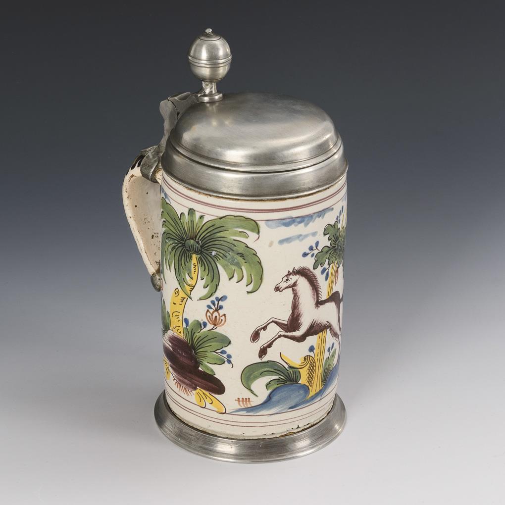 Cylindrical jug with line-decorated ribbon handle. On the front a jumping horse in a stylized landscape. Domed pewter lid with ball pusher and handle band, pewter stand ring. Slightly hair cracked, glaze rubbing, pewter with solder marks.
