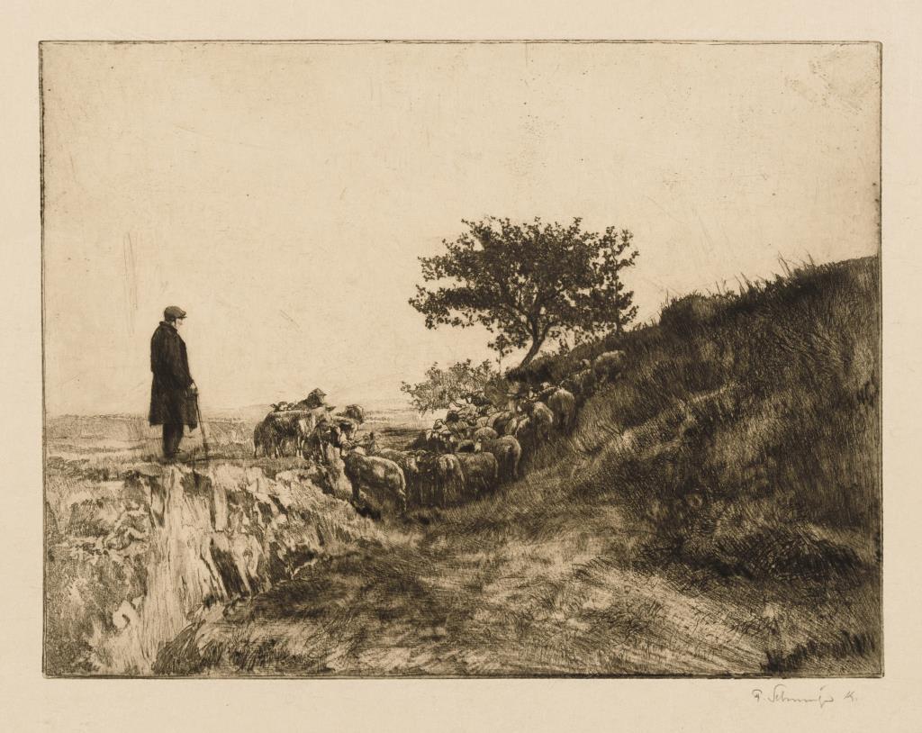 Mutter mit Kind beim Enten füttern und Hirte mit Schafen. Etwas geknickt und verschmutzt.