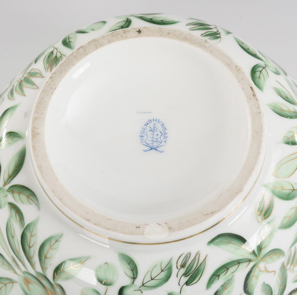 Pressed baluster jar with a dolphin as a lid knob. Circumferentially painted with foliage and 2 birds sitting in the leaves. Dolphin tail restored.