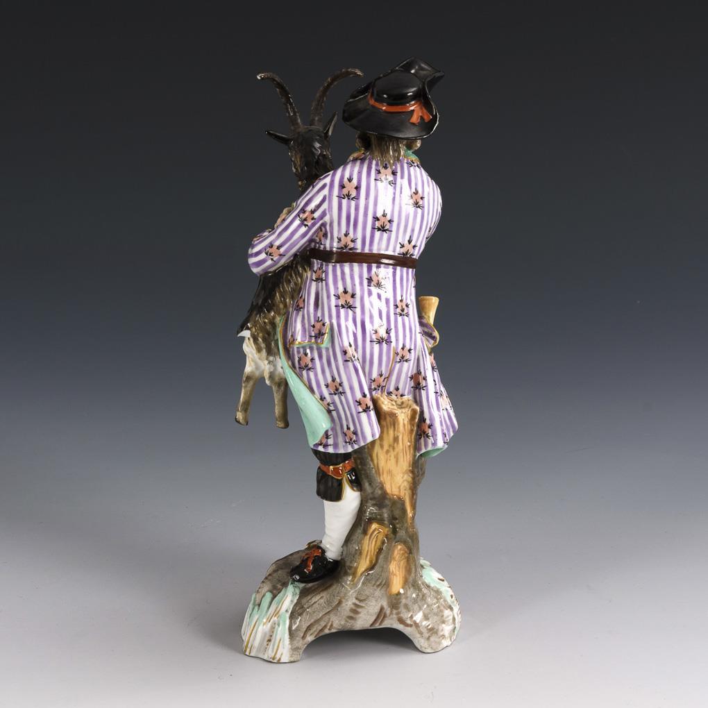 On a rocaille base standing gardener with bagpipes in buck shape. Fire crack in the base, shoe bows bumped, tail of the buck missing.