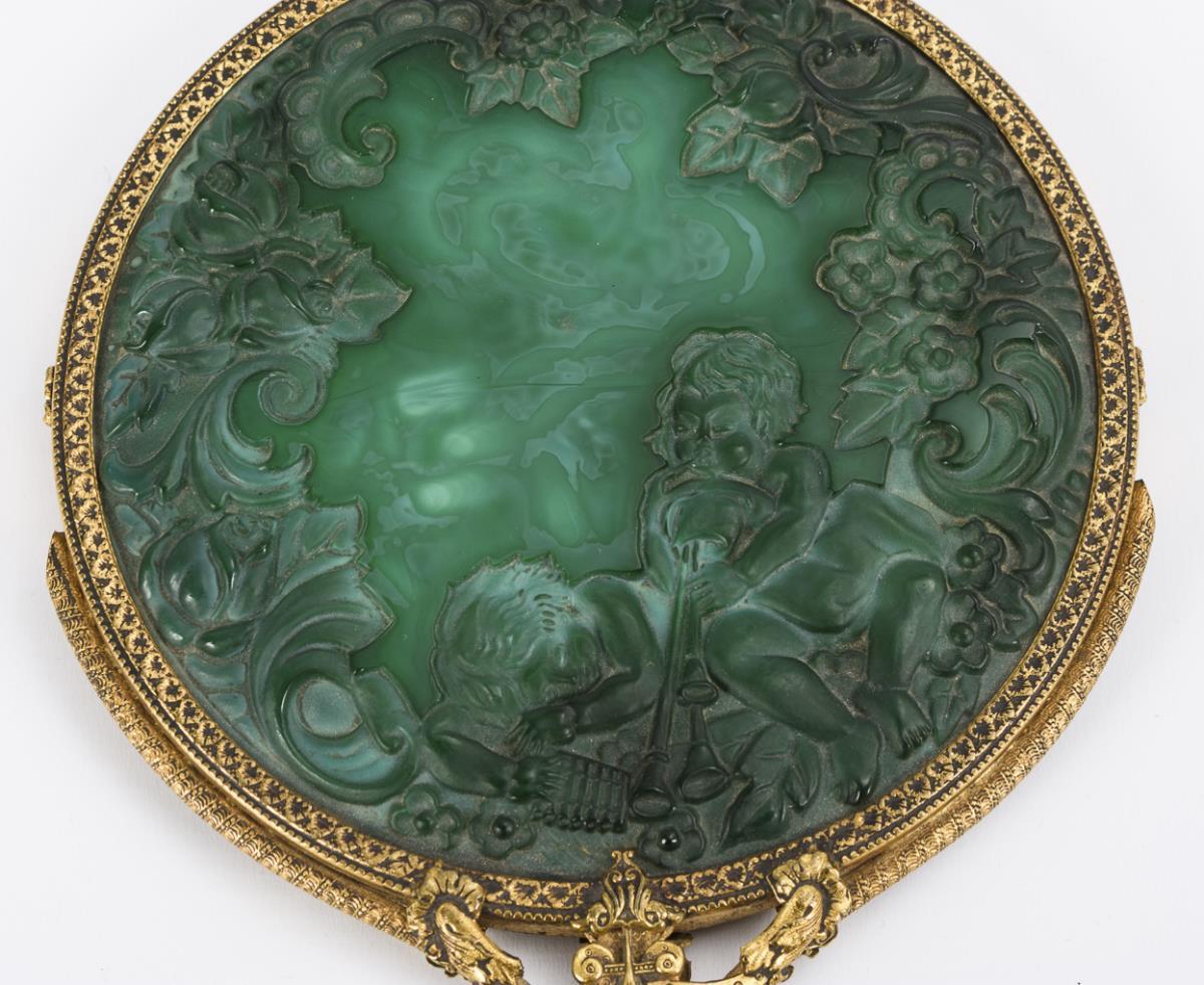 Malachite green molded and frosted glass with floral and putti relief, brass. Mirror L 37 cm, 2 brushes L 17 and 17.5 cm.