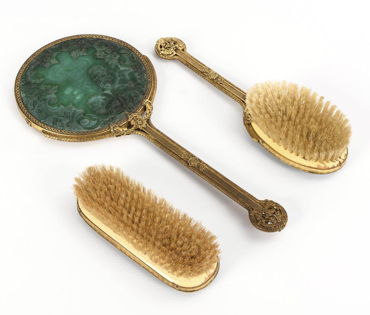 Malachite green molded and frosted glass with floral and putti relief, brass. Mirror L 37 cm, 2 brushes L 17 and 17.5 cm.