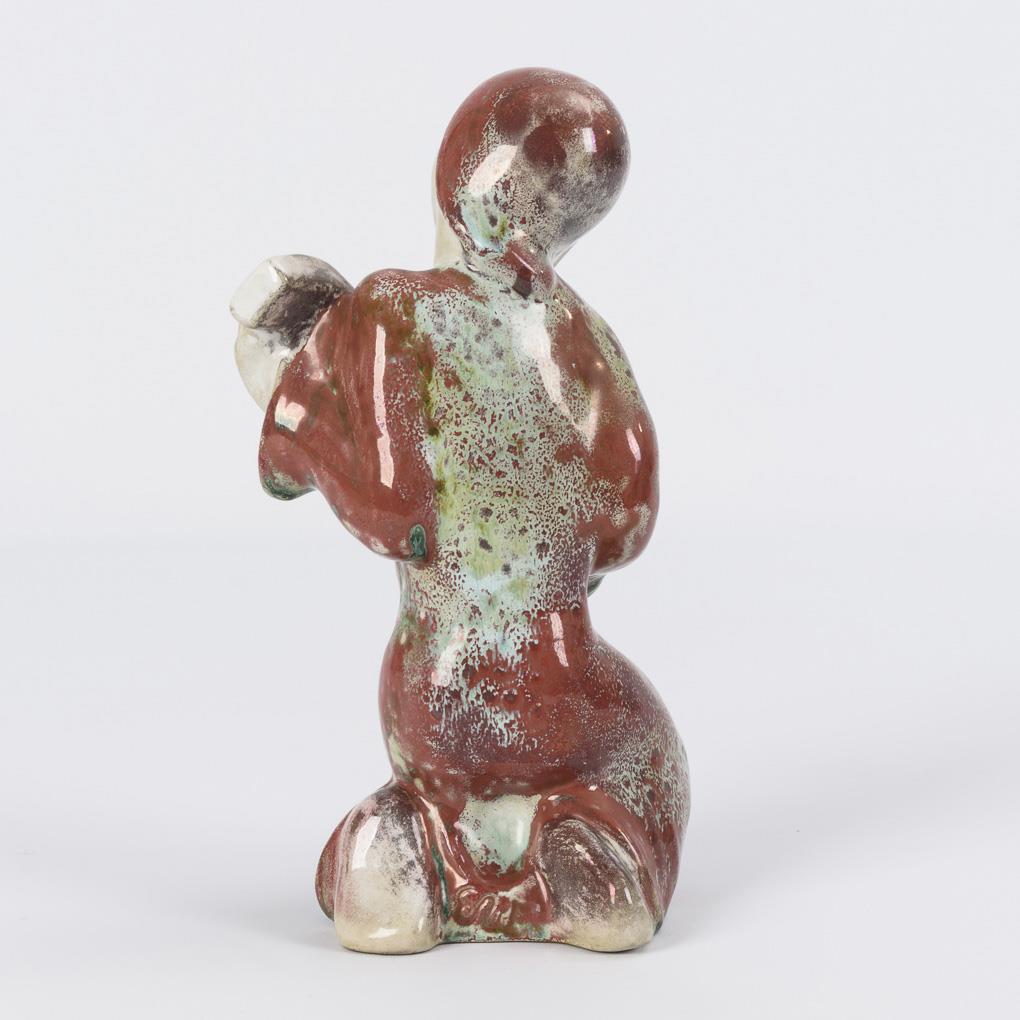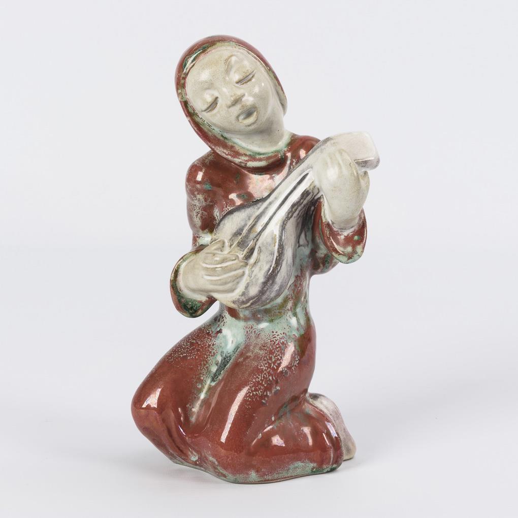 Kneeling female figure with red cape and mandolin.
