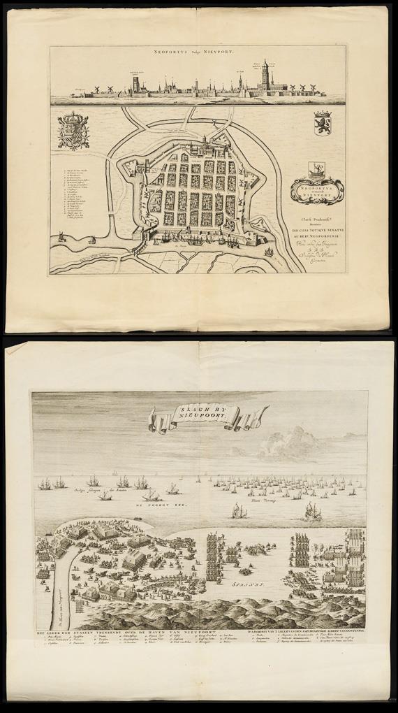 Historical view of the Belgian town of Nieuwpoort with city wall from the bird's eye view and panorama in the upper part, with legend, coat of arms and title cartouche "Neopotvs vernacule Nievport", plate: 39.5 x 51 cm, sheet: 54.5 x 64.5 cm, marginal area more strongly creased and grip-marked.